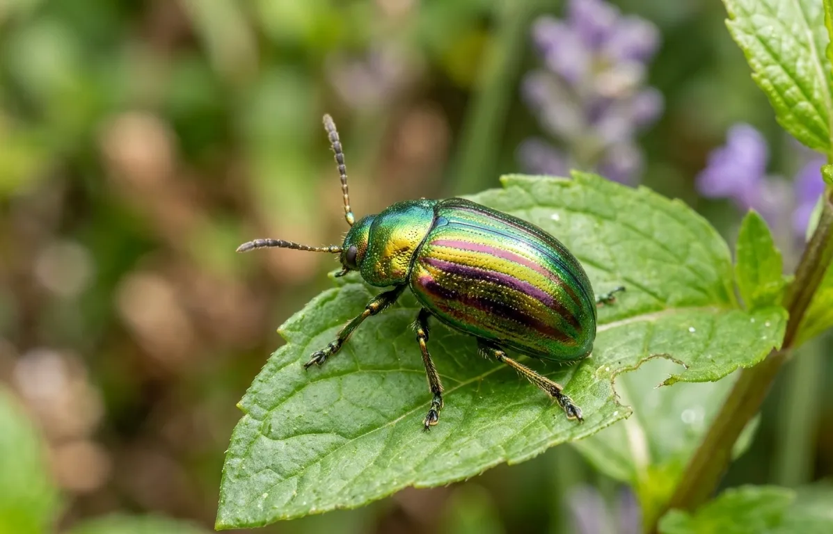 La chrysomèle du romarin arbore de superbes rayures métalliques vertes et rouges. Celle du maïs reste plus discrète mais possède une carapace bombée typique des coléoptères.